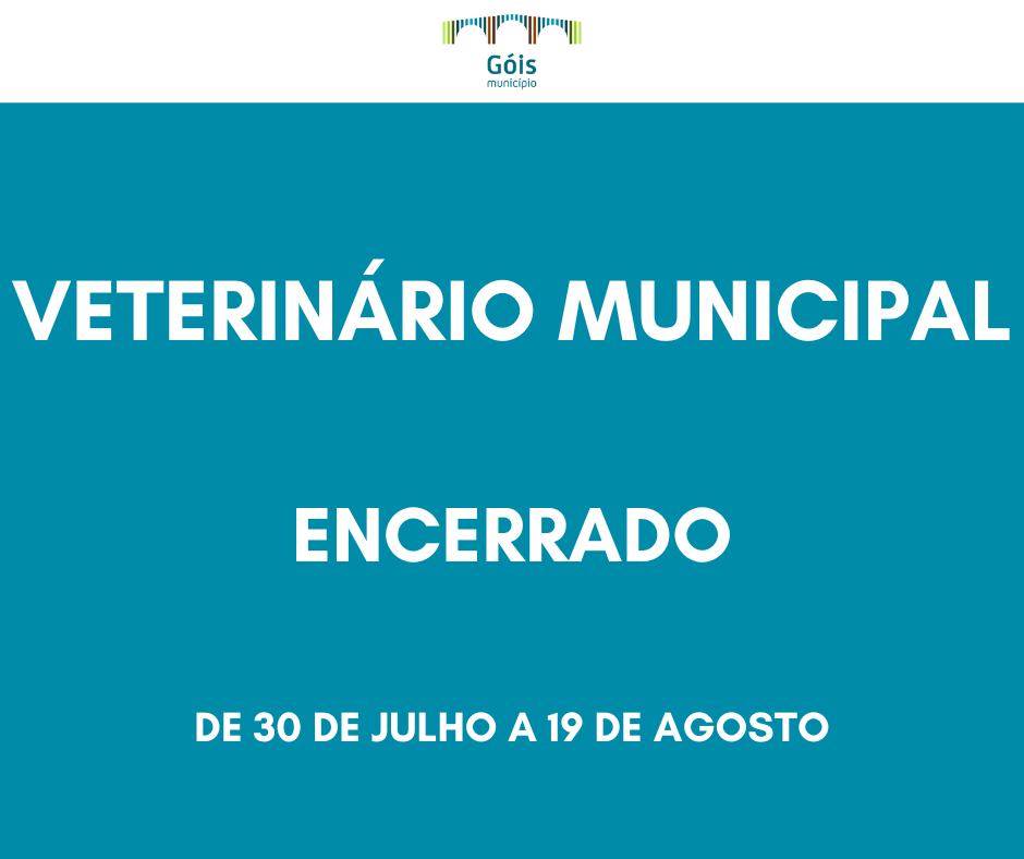O Município de Góis informa que o Veterinário Municipal se encontra encerrado por motivo de férias, até dia 19 de agosto.