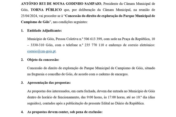 CONCESSÃO DO DIREITO DE EXPLORAÇÃO DO PARQUE MUNICIPAL DE CAMPISMO DE GÓIS ANTÓNIO RUI DE SOUSA GODINHO SAMPAIO, Presidente ...2024 Informação ao Munícipe