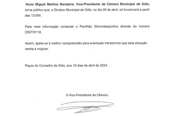 O Município de Góis informa que o Ginásio Municipal, no dia 26 de abril, só funcionará a partir das 13h00. Para mais ...2024 Informação ao Munícipe -