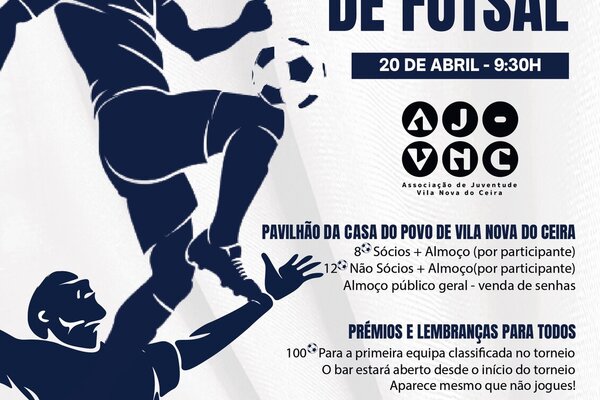 A Associação de Juventude de Vila Nova do Ceira promove o 2° Torneio de Futsal, que irá realizar-se no dia 20 de Abril, pelas ...2024 Informação ao Munícipe -