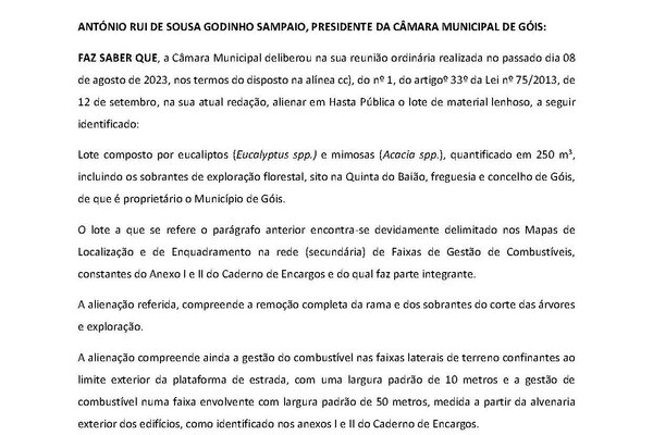 HASTA PÚBLICA DE ALIENAÇÃO DE UM LOTE DE MATERIAL LENHOSO SITO NA QUINTA DO BAIÃO PROPRIEDADE DO MUNICÍPIO DE GÓIS