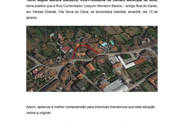 AVISOInterdição da Rua Comendador Joaquim Monteiro Bastos - antiga Rua do Canto, em Várzea Grande - Vila Nova do Ceira, no ...2024 Informação ao Munícipe -