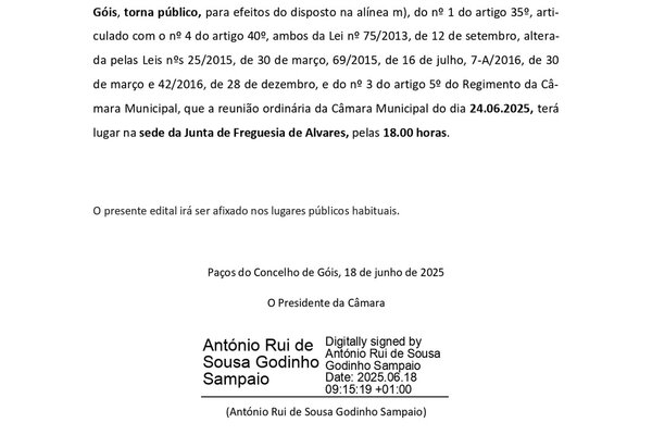 António Rui de Sousa Godinho Sampaio, Presidente da Câmara Municipal de Góis, torna público que, a reunião ordinária da Câmara ...2025 Informação ao Munícipe -