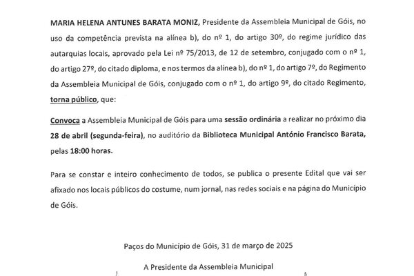 Maria Helena Antunes Barata Moniz, Presidente da Assembleia Municipal de Góis, convoca a Assembleia Municipal de Góis para uma ...2025 Informação ao Munícipe -