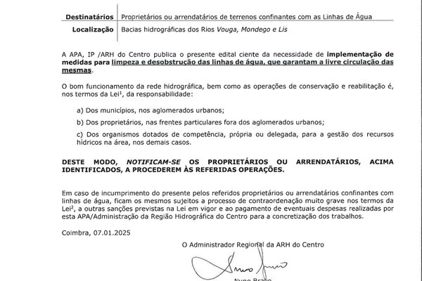 21 Fev 2025Aviso APA/ARG Centro - Limpeza de Linhas de Água