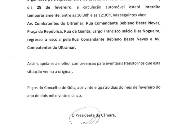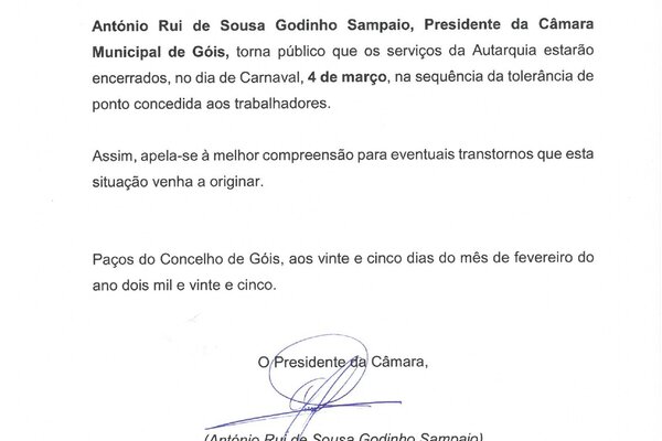 António Rui de Sousa Godinho Sampaio, Presidente da Câmara Municipal de Góis, torna público que, os serviços da Autarquia ...2025 Informação ao Munícipe -