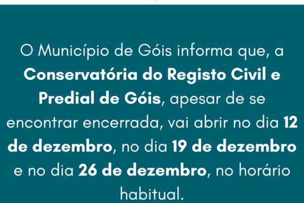 O Município de Góis informa que, a 𝐂𝐨𝐧𝐬𝐞𝐫𝐯𝐚𝐭ó𝐫𝐢𝐚 𝐝𝐨 𝐑𝐞𝐠𝐢𝐬𝐭𝐨 𝐂𝐢𝐯𝐢𝐥 𝐞 𝐏𝐫𝐞𝐝𝐢𝐚𝐥 𝐝𝐞 𝐆ó𝐢𝐬, apesar de se encontrar encerrada, vai ...2024 Informação ao Munícipe -