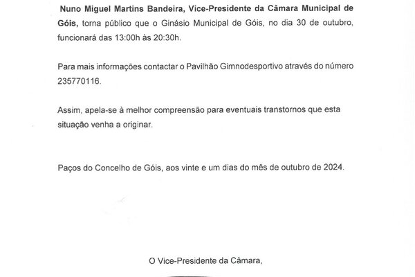 Nuno Miguel Martins Bandeira, Vice-Presidente da Câmara Municipal de Góis, torna público que o Ginásio Municipal de Góis, no ...2024 Informação ao Munícipe -