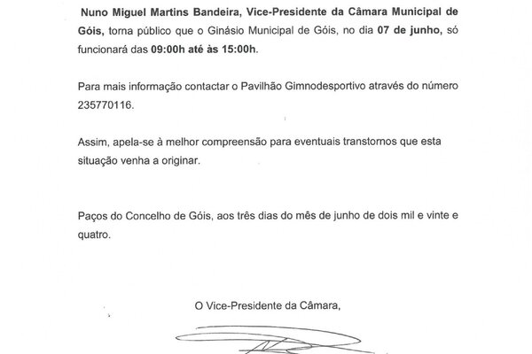 Nuno Miguel Martins Bandeira, Vice-Presidente da Câmara Municipal de Góis, torna público que o Ginásio Municipal de Góis, no ...2024 Informação ao Munícipe
