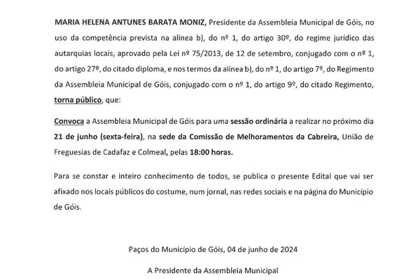 Maria Helena Antunes Barata Moniz, Presidente da Assembleia Municipal de Góis, convoca a Assembleia Municipal de Góis para uma ...2024 Informação ao Munícipe -