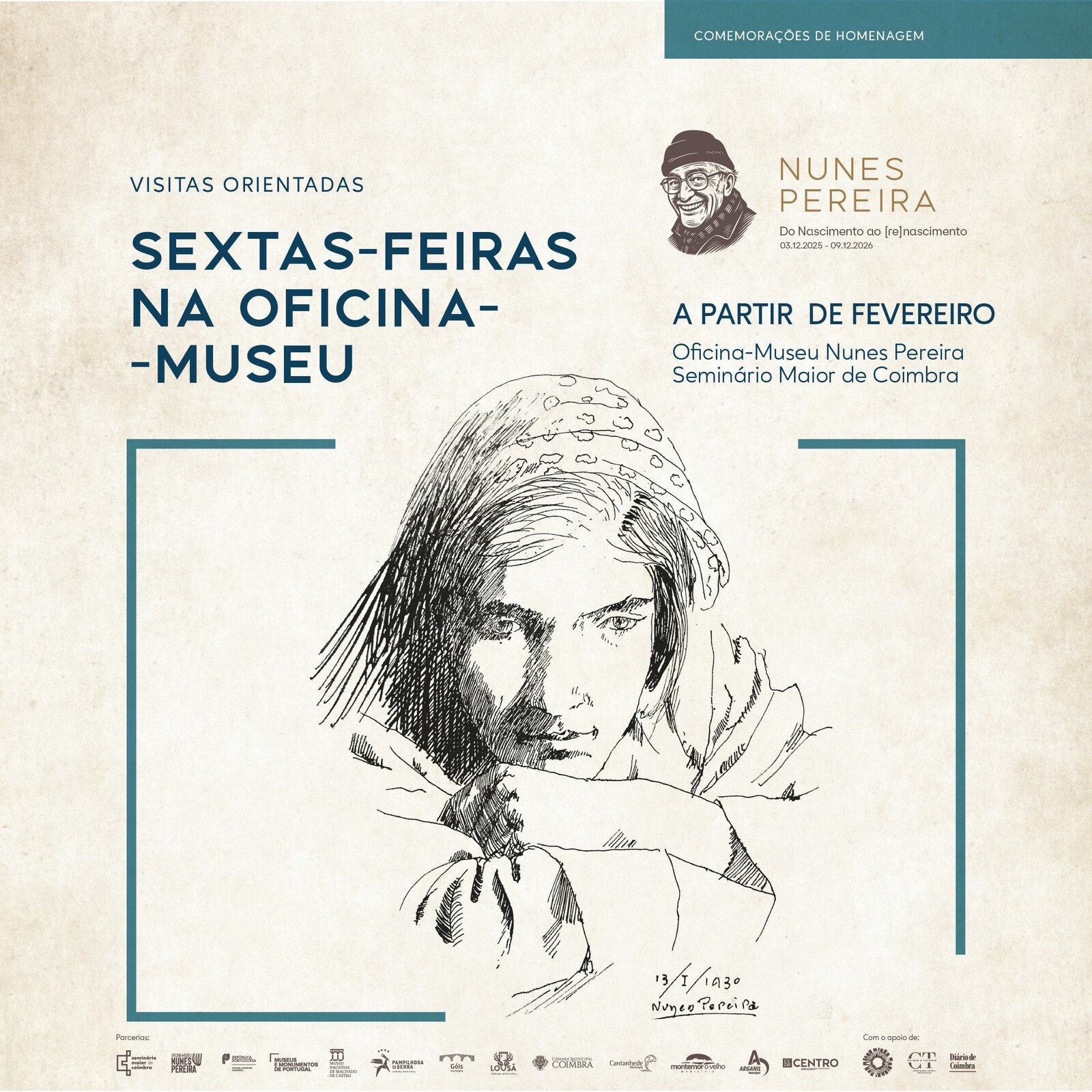 Trata-se de um ciclo cultural semanal, realizado todas as 𝐬𝐞𝐱𝐭𝐚𝐬-𝐟𝐞𝐢𝐫𝐚𝐬, à𝐬 𝟏𝟕𝐡𝟎𝟎, 𝐧𝐚 𝐎𝐟𝐢𝐜𝐢𝐧𝐚-𝐌𝐮𝐬𝐞𝐮 𝐍𝐮𝐧𝐞𝐬 𝐏𝐞𝐫𝐞𝐢𝐫𝐚, que integra visita orientada à exposição temporária “Nunes Pereira e o traço: 1927-2001”, seguida de um lanche-convívio, promovendo a fruição cultural e a partilha entre participantes.