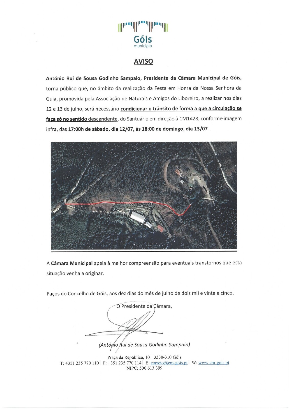 António Rui de Sousa Godinho Sampaio, Presidente da Câmara Municipal de Góis, torna público que, no âmbito da Festa em Honra de Nossa Senhora da guia, promovida pela Associação de Naturais e Amigos do Liboreiro, a realizar nos dias 12 e 13 de julho, será necessário condicionar o trânsito de forma a que a circulação se faça só no sentido descendente, do Santuário em direção à CM1428, das 17h00 de sábado, dia 12/7, às 18h00 de domingo, dia 13/07.