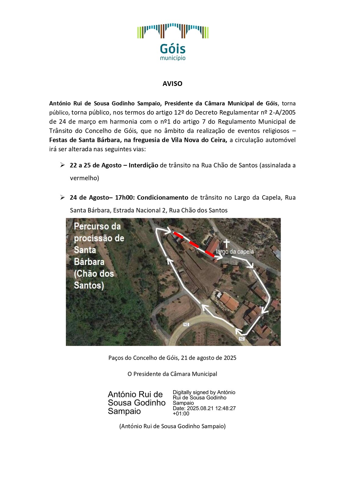 No âmbito da realização de eventos religiosos - 𝐅𝐞𝐬𝐭𝐚𝐬 𝐝𝐞 𝐒𝐚𝐧𝐭𝐚 𝐁𝐚́𝐫𝐛𝐚𝐫𝐚, na 𝐟𝐫𝐞𝐠𝐮𝐞𝐬𝐢𝐚 𝐝𝐞 𝐕𝐢𝐥𝐚 𝐍𝐨𝐯𝐚 𝐝𝐨 𝐂𝐞𝐢𝐫𝐚, a circulação automóvel irá ser alterada nas seguintes vias: