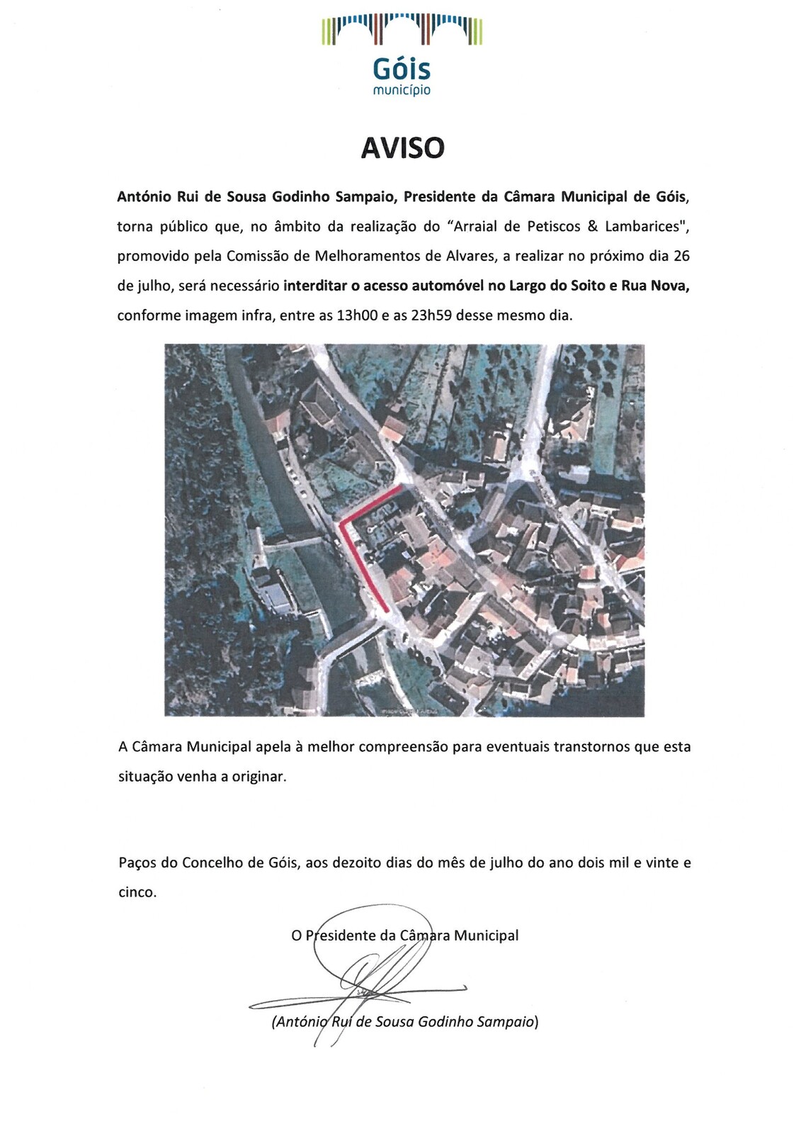 António Rui de Sousa Godinho Sampaio, Presidente da Câmara Municipal de Góis, torna público que, no âmbito da realização do "Arraial de Petiscos & Lambarices", promovido pela Comissão de Melhoramentos de Alvares, a realizar no próximo dia 26 de julho, será necessário interditar o acesso automóvel no Largo do Soito e Rua Nova, entre as 13h00 e as 23h59 desse mesmo dia.