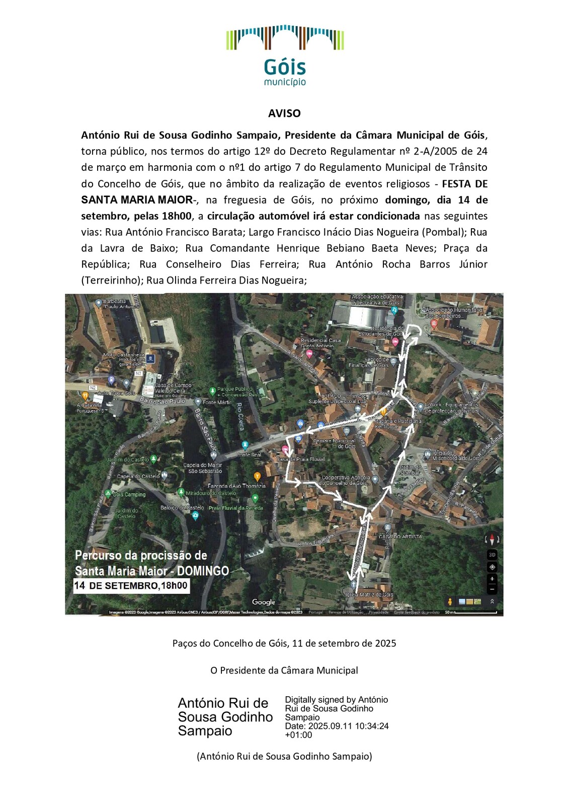 No âmbito da realização de eventos religiosos - 𝐅𝐄𝐒𝐓𝐀 𝐃𝐄 𝐒𝐀𝐍𝐓𝐀 𝐌𝐀𝐑𝐈𝐀 𝐌𝐀𝐈𝐎𝐑, na freguesia de Góis, no próximo 𝐝𝐨𝐦𝐢𝐧𝐠𝐨, 𝐝𝐢𝐚 𝟏𝟒 𝐝𝐞 𝐬𝐞𝐭𝐞𝐦𝐛𝐫𝐨, 𝐩𝐞𝐥𝐚𝐬 𝟏𝟖𝐡𝟎𝟎, 𝐚 𝐜𝐢𝐫𝐜𝐮𝐥𝐚𝐜̧𝐚̃𝐨 𝐚𝐮𝐭𝐨𝐦𝐨́𝐯𝐞𝐥 𝐢𝐫𝐚́ 𝐞𝐬𝐭𝐚𝐫 𝐜𝐨𝐧𝐝𝐢𝐜𝐢𝐨𝐧𝐚𝐝𝐚 nas vias mencionados no aviso.