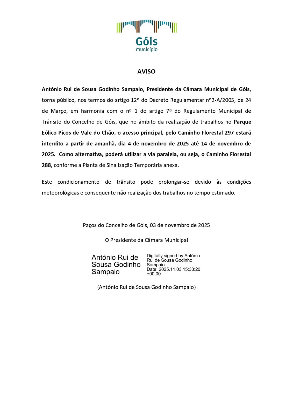 No âmbito da realização de trabalhos no Parque Eólico Picos de Vale do Chão, o acesso principal, pelo Caminho Florestal 297 estará interdito a partir de amanhã, dia 4 de novembro de 2025 até 14 de novembro de 2025. Como alternativa, poderá utilizar a via paralela, ou seja, o Caminho Florestal 288, conforme a Planta de Sinalização Temporária.