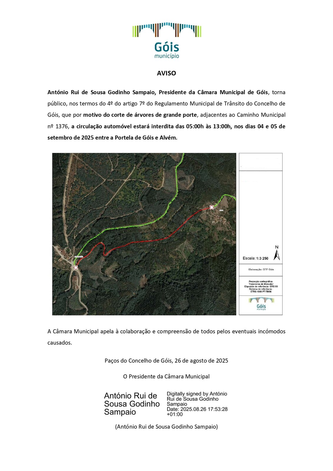António Rui de Sousa Godinho Sampaio, Presidente da Câmara Municipal de Góis, torna público que por motivo de corte de árvores de grande porte, adjacentes ao Caminho Municipal nº 1376, a circulação automóvel estará interdita das 05h00 às 13h00, nos dia 04 e 05 de setembro, entre a Portela de Góis e Alvém.