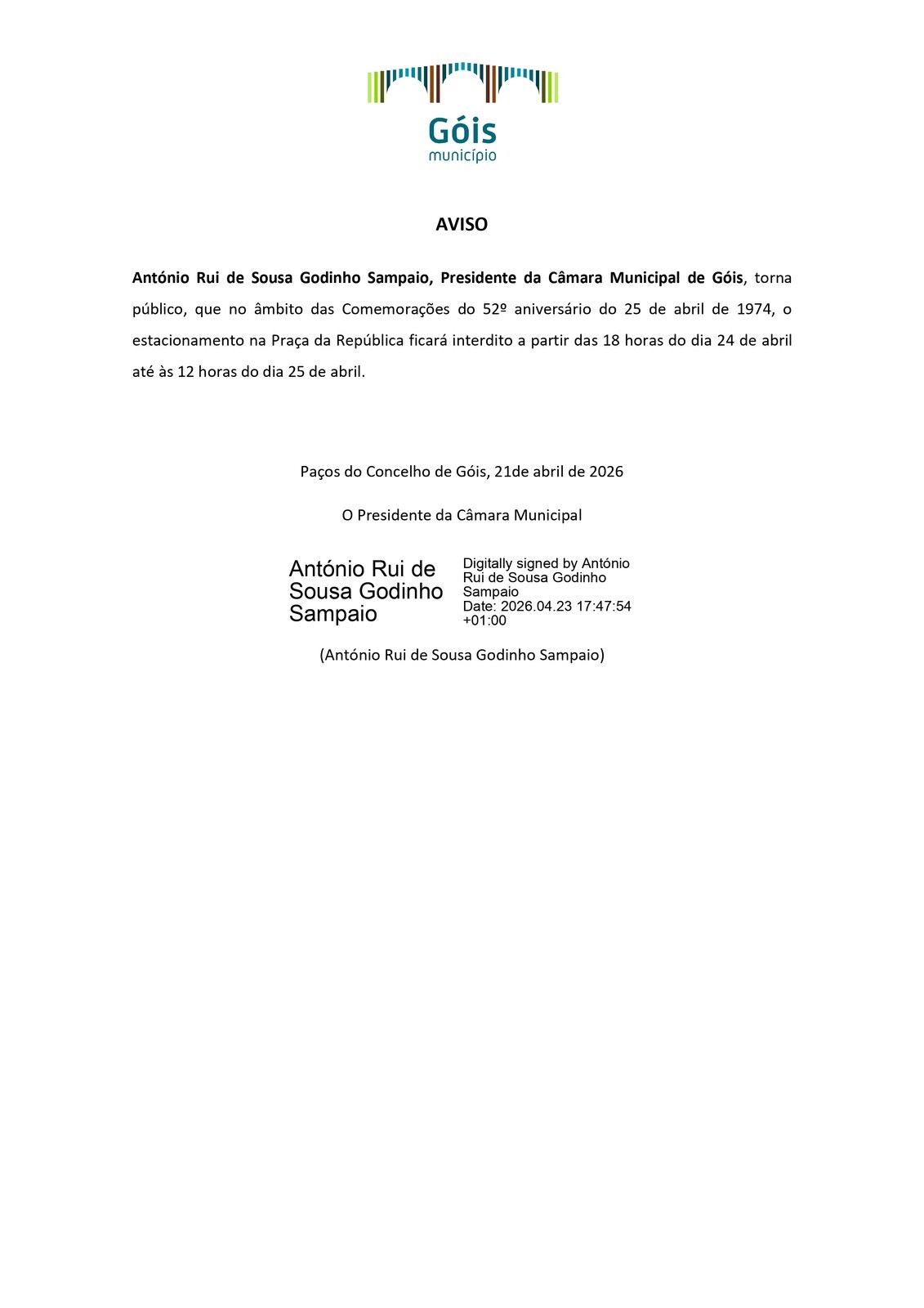 António Rui de Sousa Godinho Sampaio, Presidente da Câmara Municipal de Góis, torna público, que no âmbito das Comemorações do 52.º aniversário do 25 de abril de 1974, o estacionamento na Praça da República ficará interdito a partir das 18 horas do dia 24 de abril até às 12 horas do dia 25 de abril.