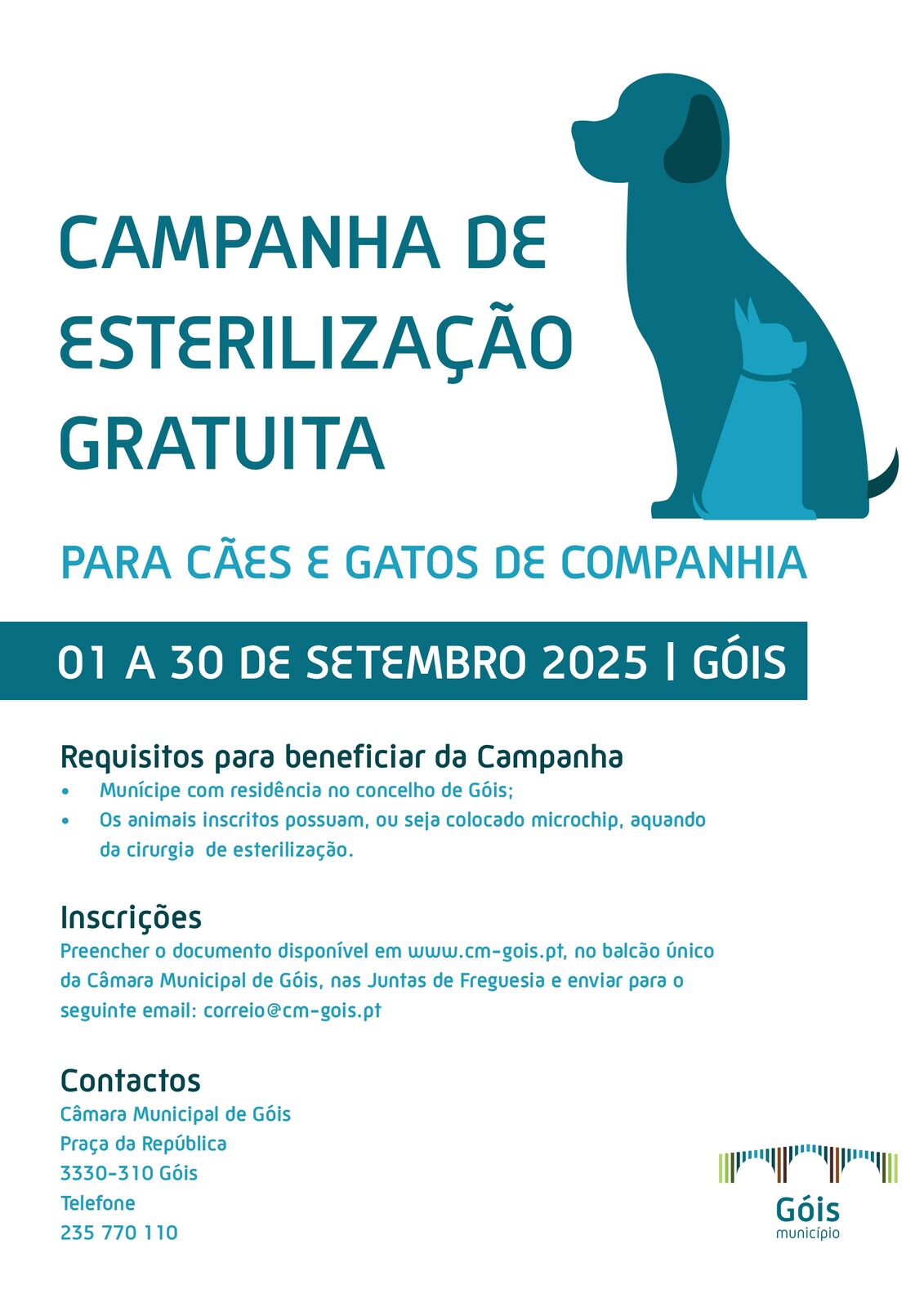 A Câmara Municipal de Góis, seguindo as recomendações da Lei n.º 27/2016, de 23 de Agosto, que privilegia a esterilização como forma de controlo da população de animais errantes, promove uma nova Campanha de Esterilização Gratuita de Animais de Companhia, que irá decorrer de 𝟎𝟏 𝐚 𝟑𝟎 𝐝𝐞 𝐬𝐞𝐭𝐞𝐦𝐛𝐫𝐨 𝐝𝐞 𝟐𝟎𝟐𝟓, sendo as intervenções cirúrgicas efetuadas em Centro de Atendimento Médico-Veterinário da região.