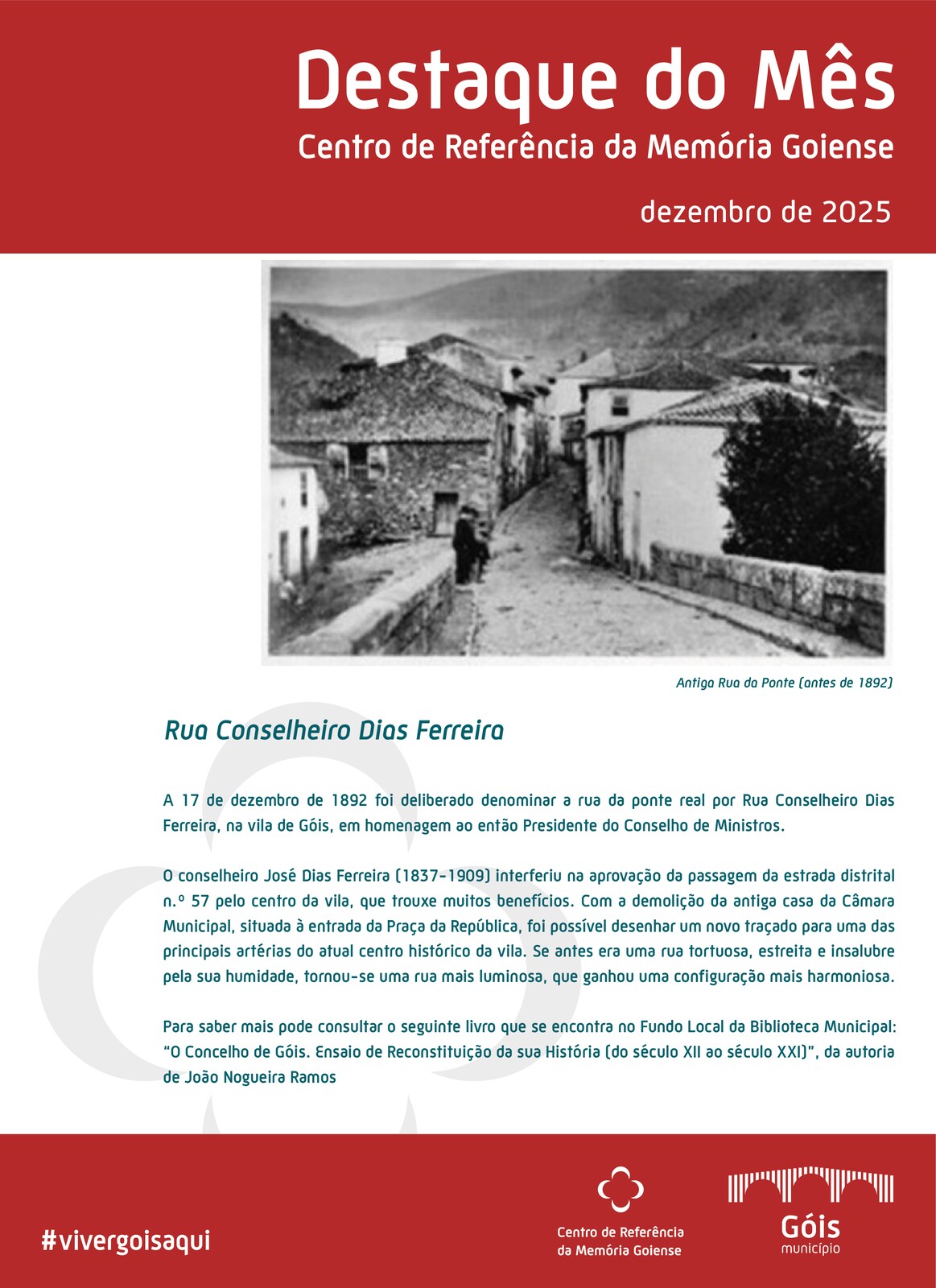A 17 de dezembro de 1892 foi deliberado denominar a rua da ponte real por Rua Conselheiro Dias Ferreira, na vila de Góis, em homenagem ao então Presidente do Conselho de Ministros.