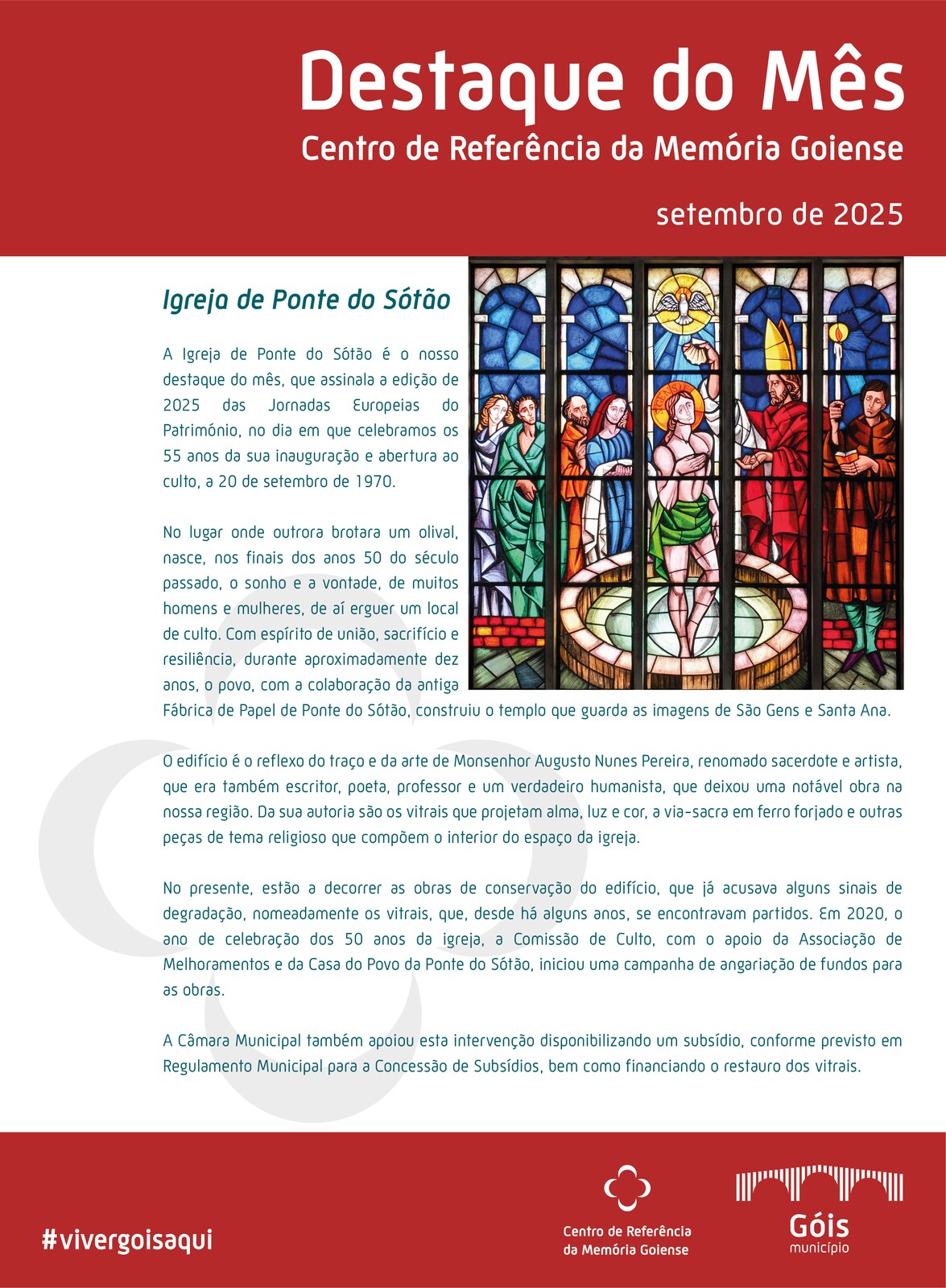 A Igreja de Ponte do Sótão é o nosso destaque do mês, que assinala a edição de 2025 das Jornadas Europeias do Património, no dia em que celebramos os 55 anos da sua inauguração e abertura ao culto, a 20 de setembro de 1970.
