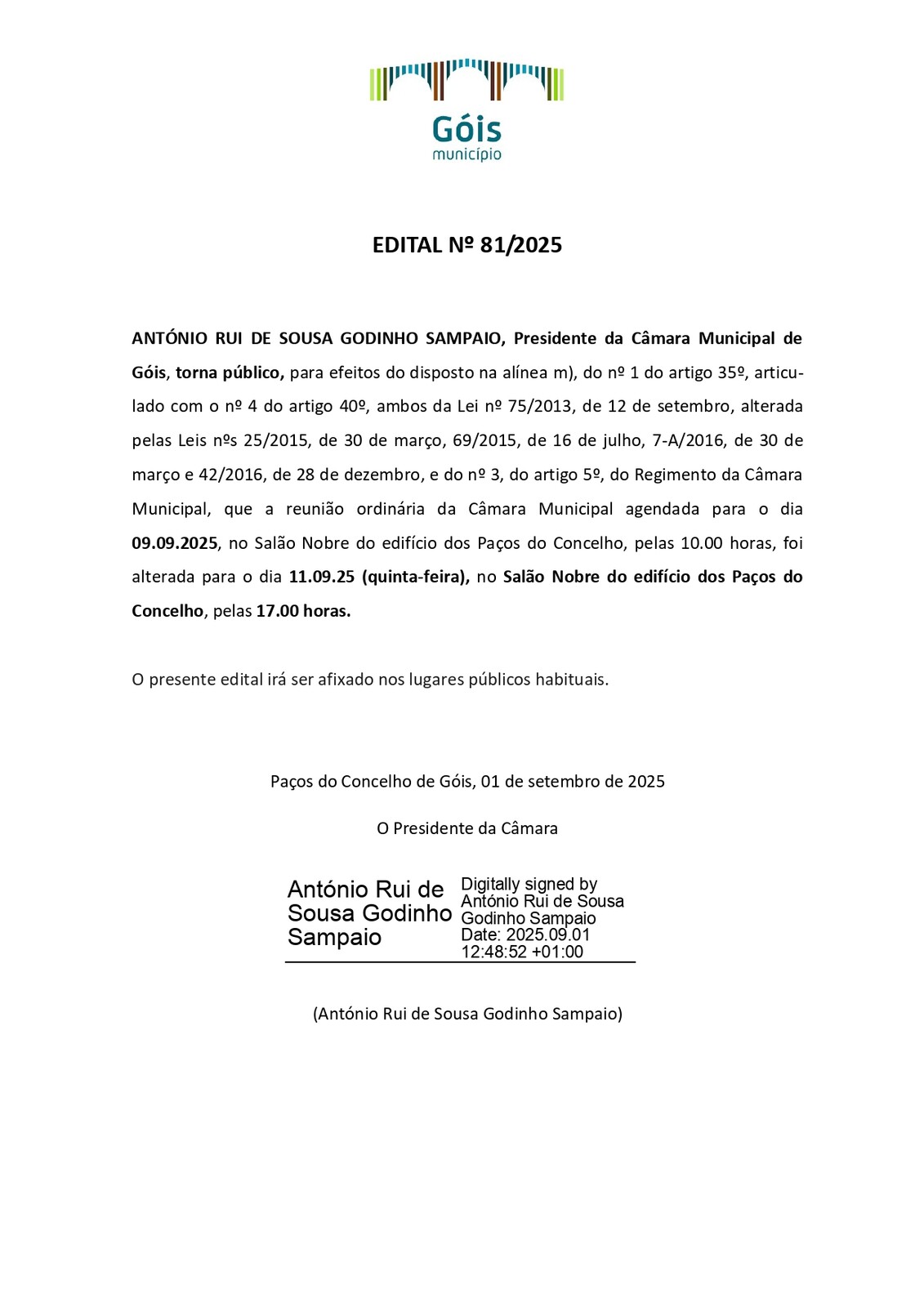 A 𝐑𝐞𝐮𝐧𝐢𝐚̃𝐨 𝐎𝐫𝐝𝐢𝐧𝐚́𝐫𝐢𝐚 𝐝𝐚 𝐂𝐚̂𝐦𝐚𝐫𝐚 𝐌𝐮𝐧𝐢𝐜𝐢𝐩𝐚𝐥 𝐝𝐞 𝐆𝐨́𝐢𝐬 agendada para o dia 9 de setembro, no Salão Nobre do edifício dos Paços do Concelho, pelas 10h00, foi alterada para o 𝐝𝐢𝐚 𝟏𝟏 𝐝𝐞 𝐬𝐞𝐭𝐞𝐦𝐛𝐫𝐨 (𝐪𝐮𝐢𝐧𝐭𝐚-𝐟𝐞𝐢𝐫𝐚), 𝐧𝐨 𝐒𝐚𝐥𝐚̃𝐨 𝐍𝐨𝐛𝐫𝐞 𝐝𝐨 𝐞𝐝𝐢𝐟𝐢́𝐜𝐢𝐨 𝐝𝐨𝐬 𝐏𝐚𝐜̧𝐨𝐬 𝐝𝐨 𝐂𝐨𝐧𝐜𝐞𝐥𝐡𝐨, 𝐩𝐞𝐥𝐚𝐬 𝟏𝟕𝐡𝟎𝟎.