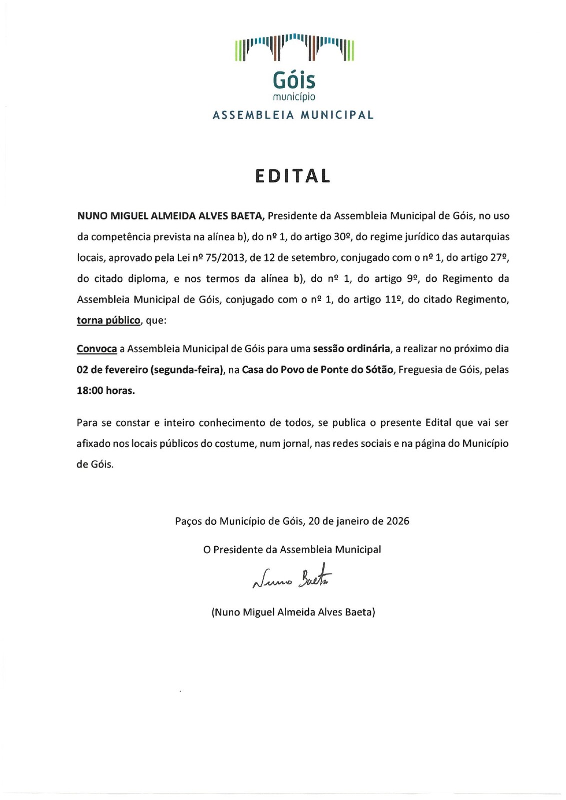 Nuno Miguel Almeida Alves Baeta, Presidente da Assembleia Municipal de Góis, convoca a Assembleia Municipal de Góis para uma 𝐬𝐞𝐬𝐬ã𝐨 𝐨𝐫𝐝𝐢𝐧á𝐫𝐢𝐚, a realizar no próximo dia 𝟎𝟐 𝐝𝐞 𝐟𝐞𝐯𝐞𝐫𝐞𝐢𝐫𝐨 (𝐬𝐞𝐠𝐮𝐧𝐝𝐚-𝐟𝐞𝐢𝐫𝐚), 𝐧𝐚 𝐂𝐚𝐬𝐚 𝐝𝐨 𝐏𝐨𝐯𝐨 𝐝𝐞 𝐏𝐨𝐧𝐭𝐞 𝐝𝐞 𝐒ó𝐭ã𝐨, 𝐅𝐫𝐞𝐠𝐮𝐞𝐬𝐢𝐚 𝐝𝐞 𝐆ó𝐢𝐬, 𝐩𝐞𝐥𝐚𝐬 𝟏𝟖𝐡𝟎𝟎.