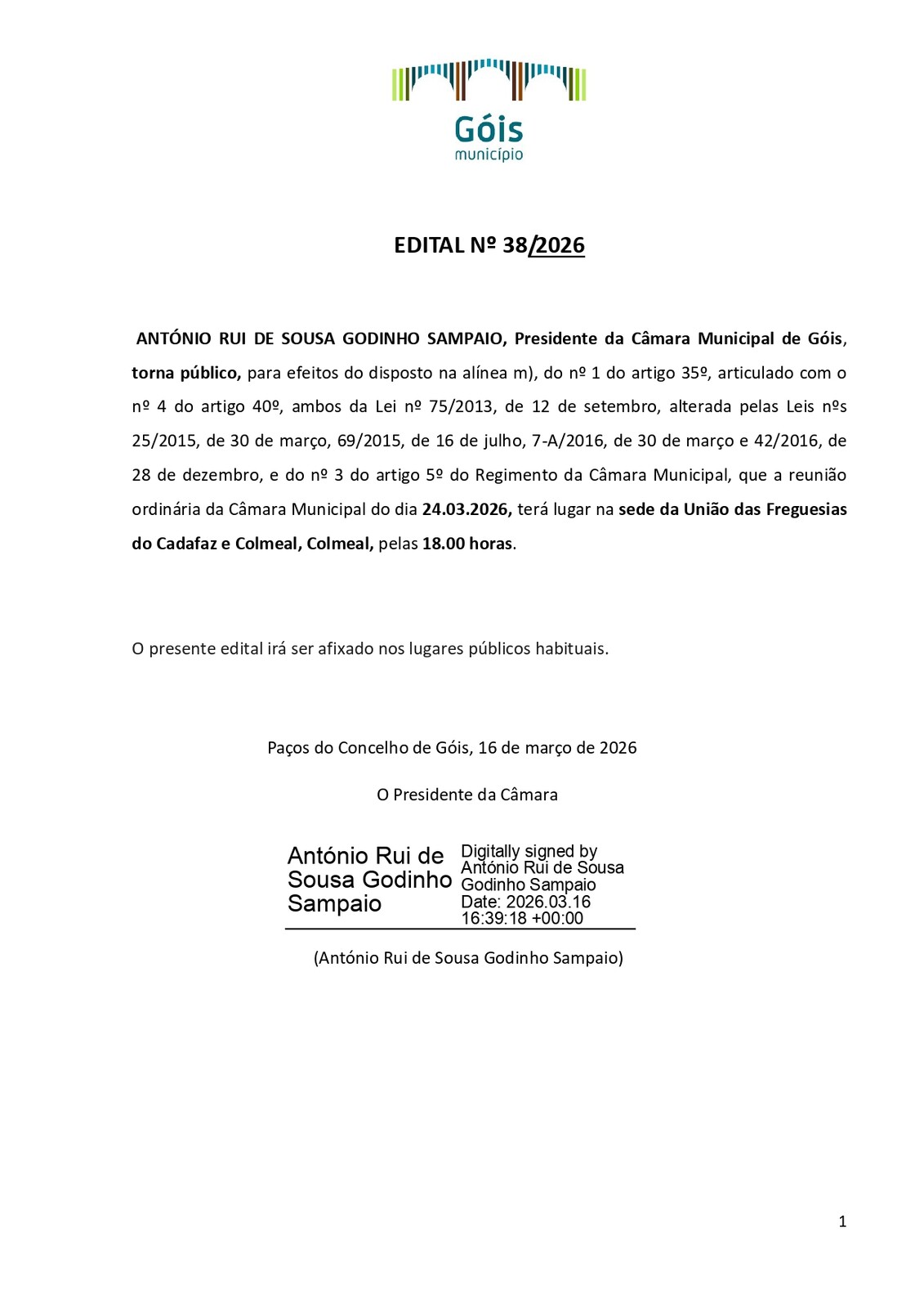 António Rui de Sousa Godinho Sampaio, Presidente da Câmara Municipal de Góis, torna público que a reunião ordinária da Câmara Municipal do dia 24.03.2026, terá lugar na Sede da União das Freguesiasdo Cadafaz e Colmeal, na localidade do Colmeal, pelas 18h00.