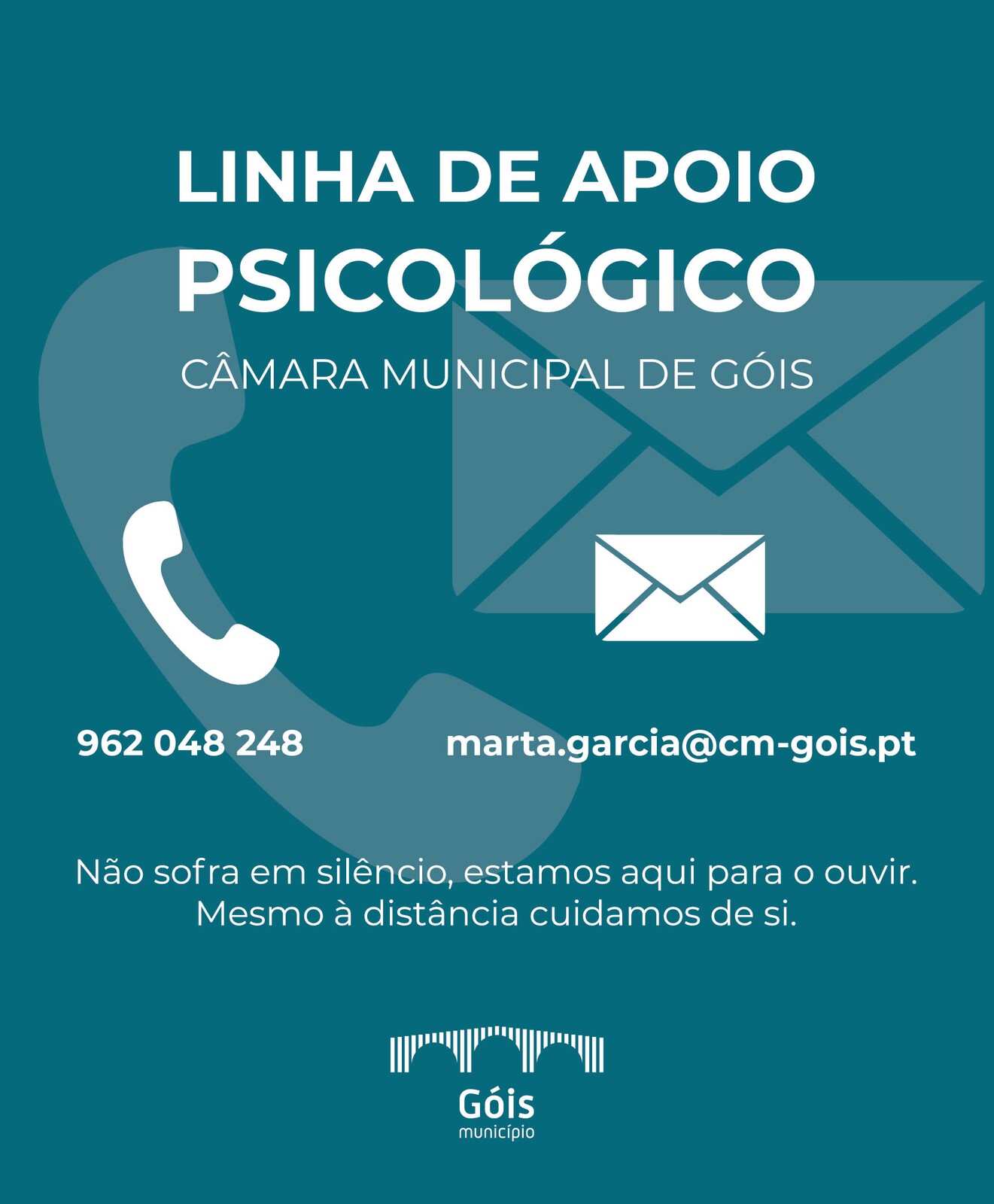 O Município de Góis dispõe de um serviço de apoio psicológico destinado a quem dele necessitar.