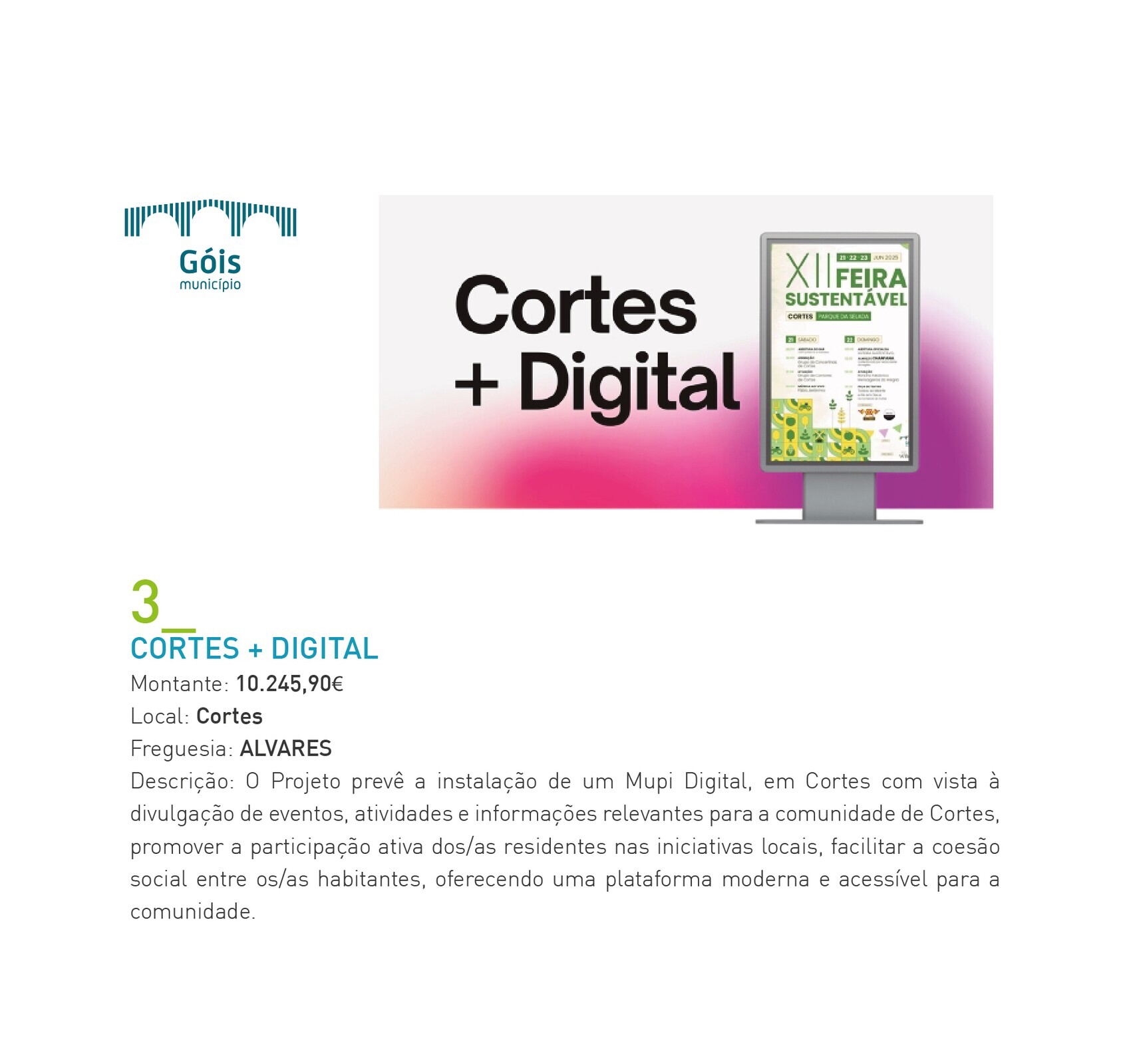 À disposição da comunidade encontra-se um projeto do 𝐎𝐫𝐜̧𝐚𝐦𝐞𝐧𝐭𝐨 𝐏𝐚𝐫𝐭𝐢𝐜𝐢𝐩𝐚𝐭𝐢𝐯𝐨 𝐉𝐨𝐯𝐞𝐦 designado “𝐑𝐞𝐪𝐮𝐚𝐥𝐢𝐟𝐢𝐜𝐚𝐜̧𝐚̃𝐨 𝐝𝐨 𝐏𝐨𝐥𝐢𝐝𝐞𝐬𝐩𝐨𝐫𝐭𝐢𝐯𝐨 𝐝𝐞 𝐂𝐨𝐫𝐭𝐞𝐬 – 𝐀𝐥𝐯𝐚𝐫𝐞𝐬” e no 𝐎𝐫𝐜̧𝐚𝐦𝐞𝐧𝐭𝐨 𝐏𝐚𝐫𝐭𝐢𝐜𝐢𝐩𝐚𝐭𝐢𝐯𝐨 𝐆𝐞𝐫𝐚𝐥 é possível escolher um dos três projetos concorrentes: o “𝐁𝐚𝐥𝐨𝐢𝐜̧𝐨 𝐩𝐚𝐧𝐨𝐫𝐚̂𝐦𝐢𝐜𝐨 𝐞𝐦 𝐀𝐥𝐯𝐚𝐫𝐞𝐬”, “𝐂𝐡𝐮𝐫𝐫𝐚𝐬𝐪𝐮𝐞𝐢𝐫𝐚 𝐜𝐨𝐦𝐮𝐧𝐢𝐭𝐚́𝐫𝐢𝐚 𝐜𝐨𝐦 𝐭𝐞𝐥𝐡𝐚𝐝𝐨 𝐞 𝐦𝐞𝐬𝐚𝐬 𝐝𝐞 𝐦𝐚𝐝𝐞𝐢𝐫𝐚” 𝐧𝐚 𝐏𝐫𝐚𝐢𝐚 𝐅𝐥𝐮𝐯𝐢𝐚𝐥 𝐝𝐚𝐬 𝐂𝐚𝐧𝐚𝐯𝐞𝐢𝐚𝐬 𝐞 “𝐂𝐨𝐫𝐭𝐞𝐬 + 𝐃𝐢𝐠𝐢𝐭𝐚𝐥” (𝐌𝐮𝐩𝐢).