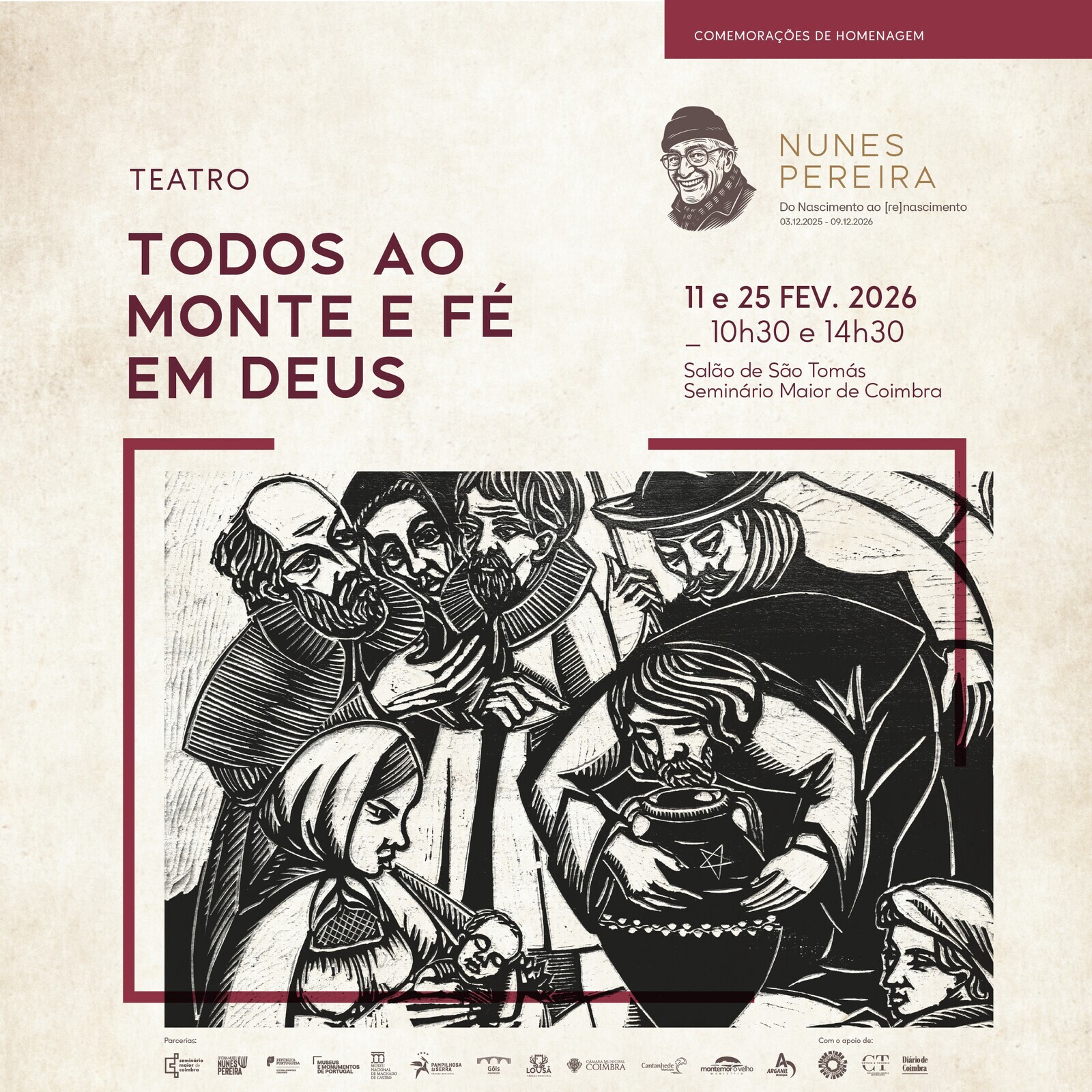 No âmbito das Comemorações de Homenagem a Monsenhor Nunes Pereira, o Município de Góis partilha que, nos dias 11 e 25 de fevereiro de 2026, serão apresentadas duas sessões, pelas 10h30 e pelas 14h30, no Salão de São Tomás do Seminário Maior de Coimbra, a peça de teatro “Todos ao Monte e Fé em Deus”, uma criação das companhias de teatro Encerrado para Obras e NAVIO.