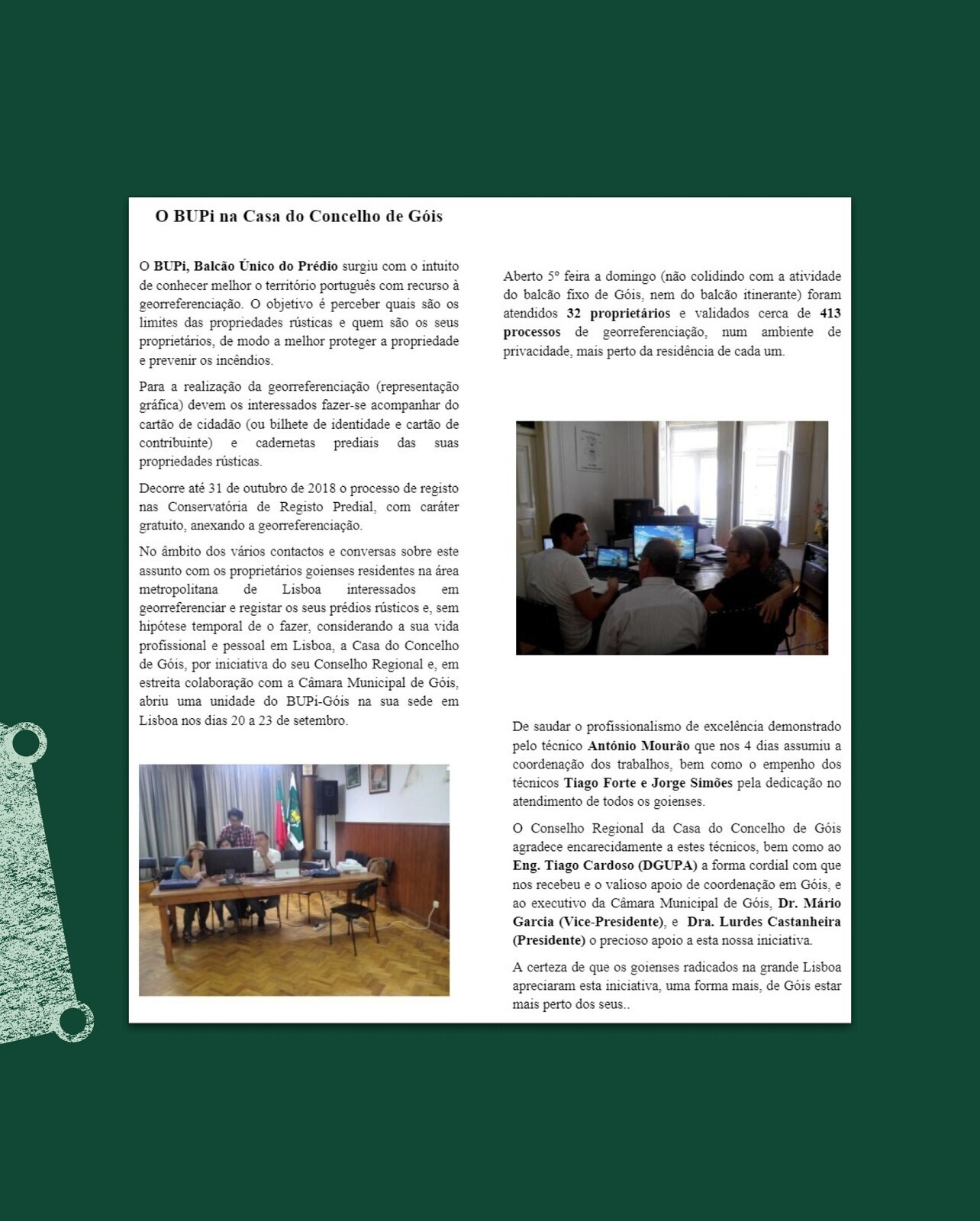 O Balcão BUPi de Góis quis ajudar os goienses que, nas décadas de 60 e 70, migraram para a capital e, em 2018, foi até à Casa do Concelho de Góis, em Lisboa, para apoiar esses proprietários a localizar e identificar os seus terrenos no BUPi.