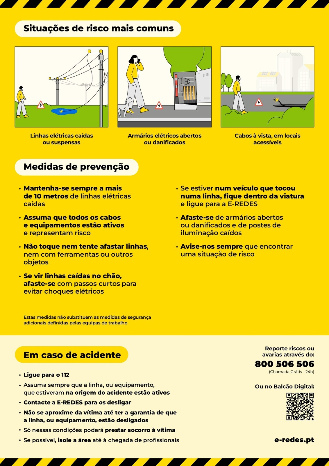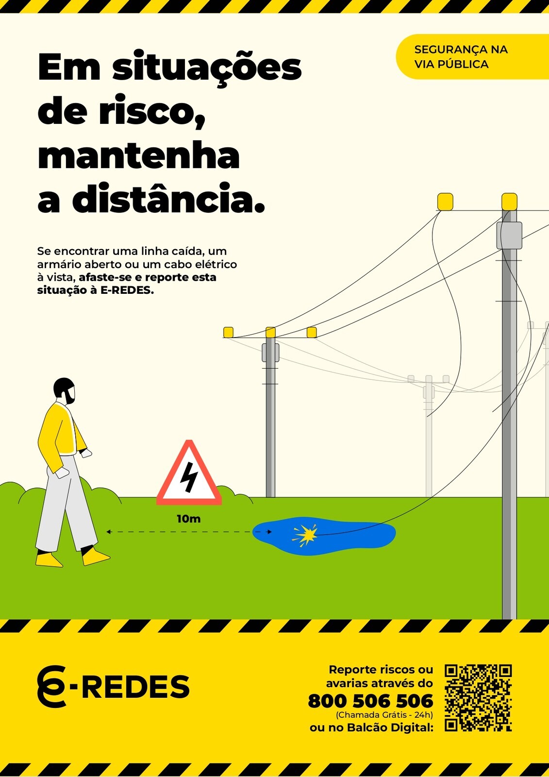 Alerta para perigos de cabos caídos! Se encontrar uma linha caída, um armário aberto ou um cabo elétrico à vista, afaste-se e reporte esta situação à E-REDES.