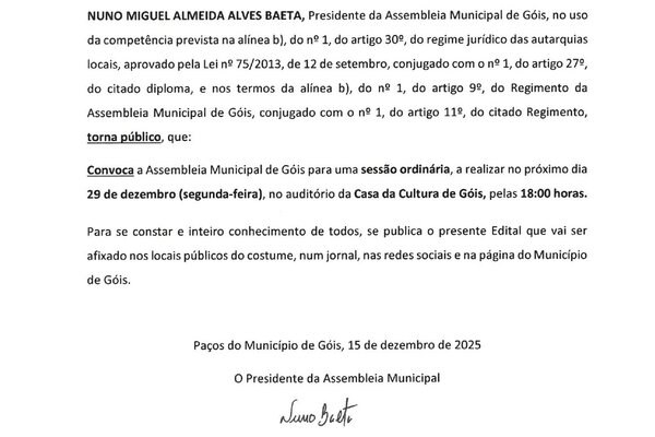 Nuno Miguel Almeida Alves Baeta, Presidente da Assembleia Municipal de Góis, convoca a Assembleia Municipal de Góis para uma ...2025 Informação ao Munícipe -