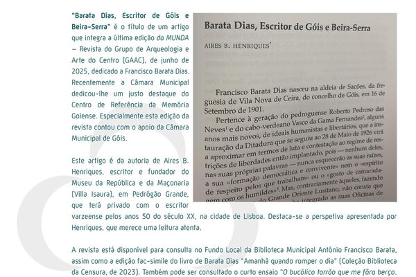 Novembro 2025 𝗔𝗿𝘁𝗶𝗴𝗼 𝗱𝗮 𝗥𝗲𝘃𝗶𝘀𝘁𝗮 𝗠𝘂𝗻𝗱𝗮 “𝗕𝗮𝗿𝗮𝘁𝗮 𝗗𝗶𝗮𝘀, 𝗘𝘀𝗰𝗿𝗶𝘁𝗼𝗿 𝗱𝗲 𝗚ó𝗶𝘀 𝗲 𝗕𝗲𝗶𝗿𝗮-𝗦𝗲𝗿𝗿𝗮”é o título de um artigo que integra a ...2025 Informação ao Munícipe -