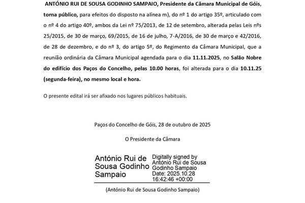 A reunião ordinária da Câmara Municipal agendada para o dia 11.11.2025, no 𝐒𝐚𝐥𝐚̃𝐨 𝐍𝐨𝐛𝐫𝐞 𝐝𝐨 𝐞𝐝𝐢𝐟𝐢́𝐜𝐢𝐨 𝐝𝐨𝐬 𝐏𝐚𝐜̧𝐨𝐬 𝐝𝐨 𝐂𝐨𝐧𝐜𝐞𝐥𝐡𝐨, ...2025 Informação ao Munícipe -