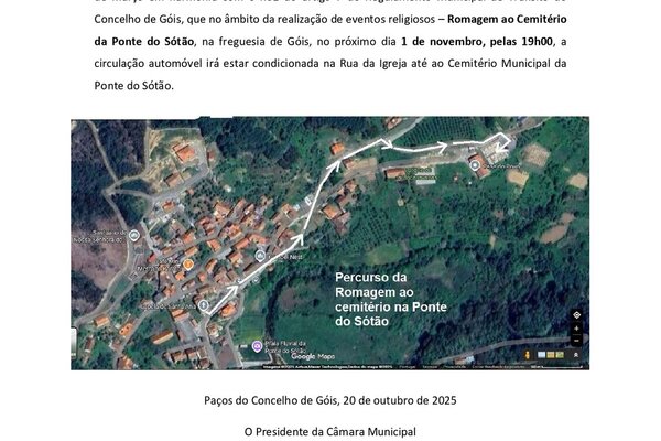 No âmbito da realização de eventos religiosos - 𝐑𝐨𝐦𝐚𝐠𝐞𝐦 𝐚𝐨 𝐂𝐞𝐦𝐢𝐭𝐞́𝐫𝐢𝐨 𝐝𝐚 𝐏𝐨𝐧𝐭𝐞 𝐝𝐨 𝐒𝐨́𝐭𝐚̃𝐨 - na freguesia de Góis, no próximo ...2025 Informação ao Munícipe -