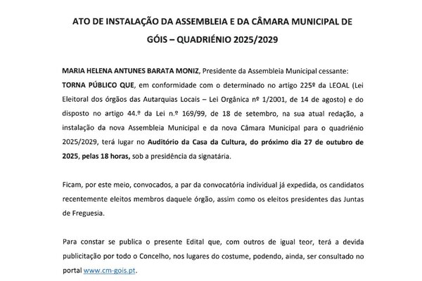 𝐀𝐭𝐨 𝐝𝐞 𝐈𝐧𝐬𝐭𝐚𝐥𝐚𝐜̧𝐚̃𝐨 𝐝𝐚 𝐀𝐬𝐬𝐞𝐦𝐛𝐥𝐞𝐢𝐚 𝐞 𝐝𝐚 𝐂𝐚̂𝐦𝐚𝐫𝐚 𝐌𝐮𝐧𝐢𝐜𝐢𝐩𝐚𝐥 𝐝𝐞 𝐆𝐨́𝐢𝐬 - 𝐐𝐮𝐚𝐝𝐫𝐢𝐞́𝐧𝐢𝐨 𝟐𝟎𝟐𝟓/𝟐𝟎𝟐𝟗 A instalação da nova Assembleia ...2025 Informação ao Munícipe -