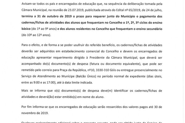 Gratuitidade dos Cadernos/ Fichas de atividades aos alunos dos 1, 2 e 3º Ciclos do Ensino Básico e Secundário