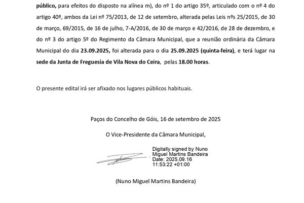 A 𝐑𝐞𝐮𝐧𝐢𝐚̃𝐨 𝐎𝐫𝐝𝐢𝐧𝐚́𝐫𝐢𝐚 𝐝𝐚 𝐂𝐚̂𝐦𝐚𝐫𝐚 𝐌𝐮𝐧𝐢𝐜𝐢𝐩𝐚𝐥 𝐝𝐞 𝐆𝐨́𝐢𝐬 do dia 23.09.2025, foi alterada para o dia 𝟐𝟓.𝟎𝟗.𝟐𝟎𝟐𝟓 (𝐪𝐮𝐢𝐧𝐭𝐚-𝐟𝐞𝐢𝐫𝐚), e ...2025 Informação ao Munícipe -