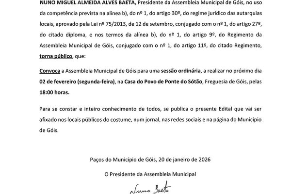 Nuno Miguel Almeida Alves Baeta, Presidente da Assembleia Municipal de Góis, convoca a Assembleia Municipal de Góis para uma ...2026 Informação ao Munícipe -