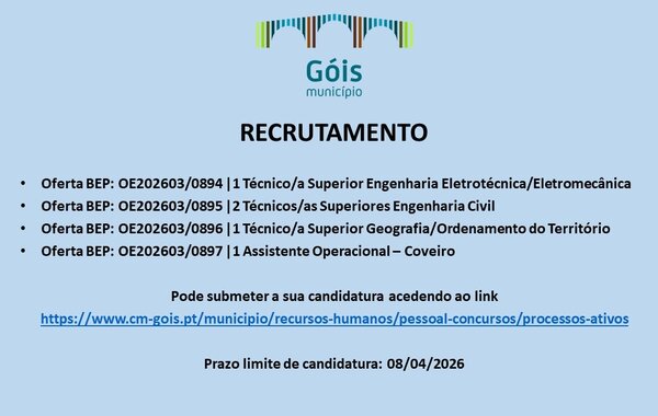 O Município de Góis tem procedimentos concursais abertos para reforço de equipas técnicas e operacionais. Estão em ...2026 Informação ao Munícipe -