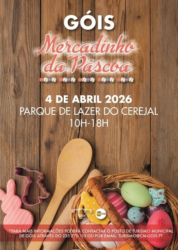 O Município de Góis promove mais uma edição do Mercadinho da Páscoa, que irá decorrer no 𝐏𝐚𝐫𝐪𝐮𝐞 𝐝𝐞 𝐋𝐚𝐳𝐞𝐫 𝐝𝐨 𝐂𝐞𝐫𝐞𝐣𝐚𝐥, 𝐧𝐨 𝐝𝐢𝐚 𝟒 𝐝𝐞 𝐚𝐛𝐫𝐢𝐥, 𝐝𝐚𝐬 𝟏𝟎𝐡𝟎𝟎 à𝐬 𝟏𝟖𝐡𝟎𝟎.