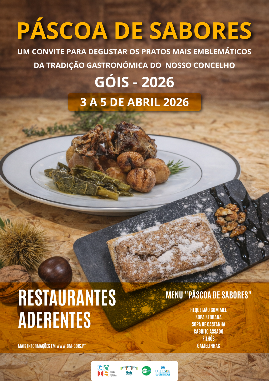 O Município de Góis promove, entre os dias 3 e 5 de abril, mais uma edição da iniciativa “Páscoa de Sabores”, convidando a comunidade e todos/as os/as visitantes a descobrir e saborear alguns dos pratos mais emblemáticos da tradição gastronómica do concelho, associados à época pascal.
