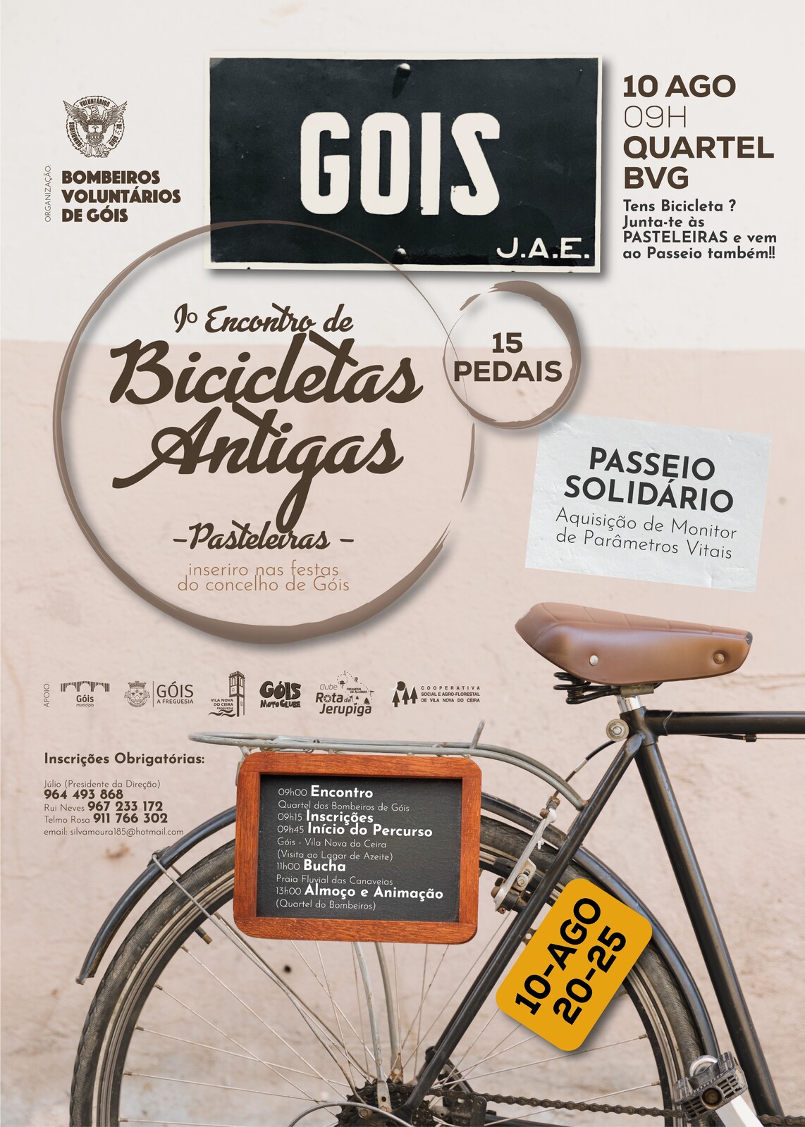 No âmbito da programação das Festas do Concelho de Góis, no dia 10 de agosto, pelas 09h00, com inicío no Quartel dos Bombeiros Voluntários de Góis, irá decorrer o 1º Encontro de Bicicletas Antigas e Pasteleiras, uma iniciativa solidária promovida pelos Bombeiros Voluntários de Góis, em parceria com o Município de Góis, com o objetivo de adquirir um monitor de parâmetros vitais.