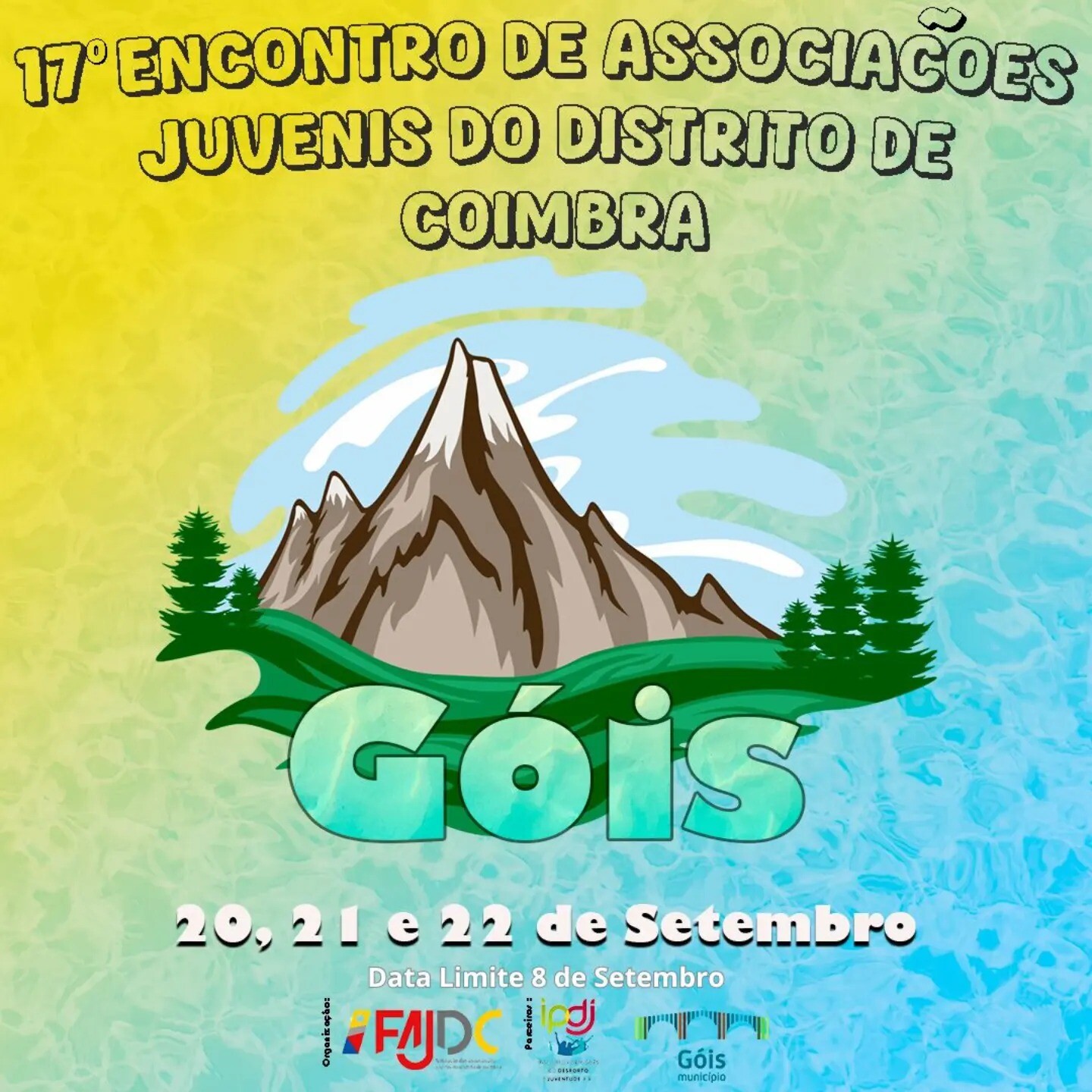 O Município de Góis irá acolher o 17º Encontro de Associações Juvenis do Distrito de Coimbra, em parceria com Federação das Associações Juvenis do Distrito de Coimbra (FAJDC), nos dias 20, 21 e 22 de setembro.