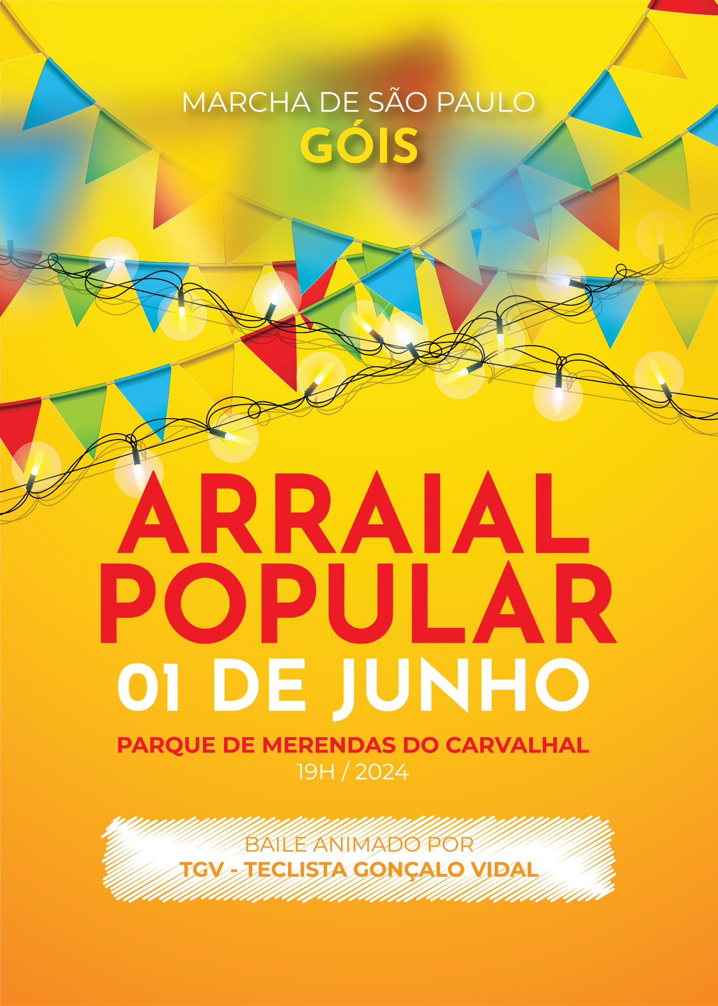 No dia 1 de Junho, a partir das 19h00, não perca o Arraial Popular da Marcha de São Paulo, no Parque de Merendas do Carvalhal, com animação do Teclista Gonçalo Vidal.
