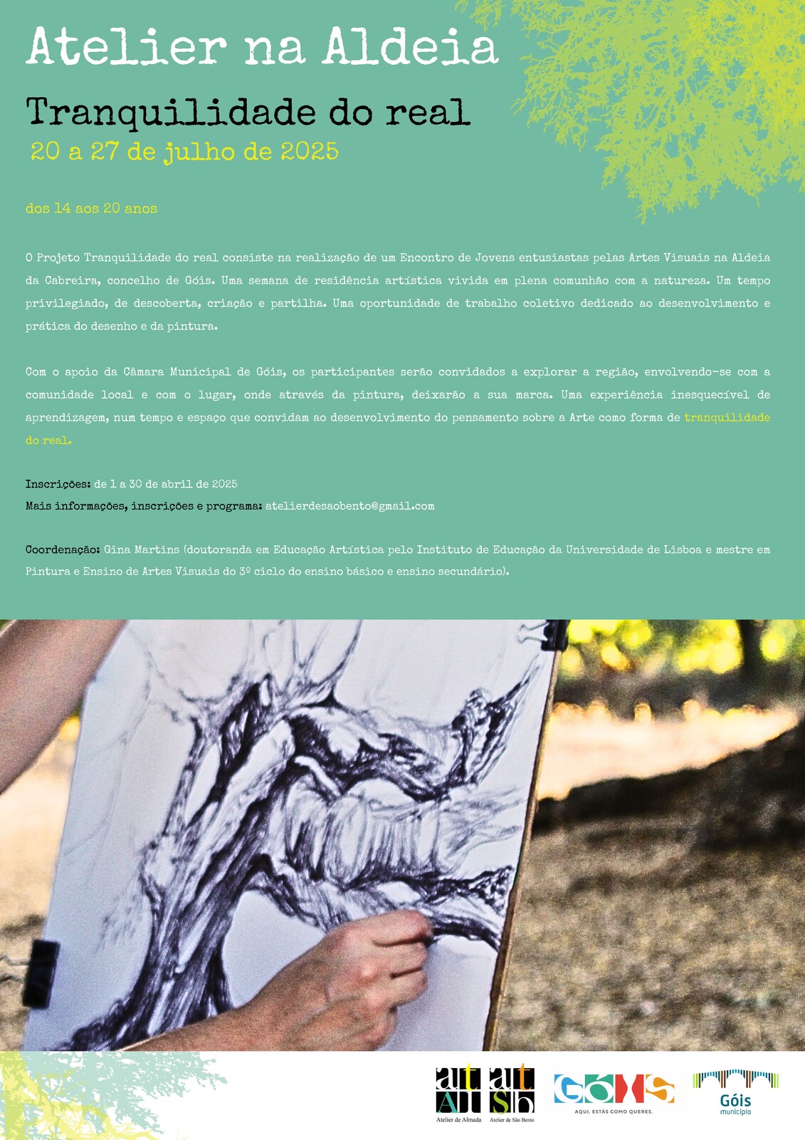 Este projeto consiste na realização de um encontro de jovens entusiastas pelas Artes Visuais na Aldeia da Cabreira, concelho de Góis. Uma semana de residência artística vivida em plena comunhão com a natureza. Um tempo privilegiado, de descoberta, criação e partilha. Uma oportunidade de trabalho coletivo dedicado ao desenvolvimento e prática do desenho e da pintura.