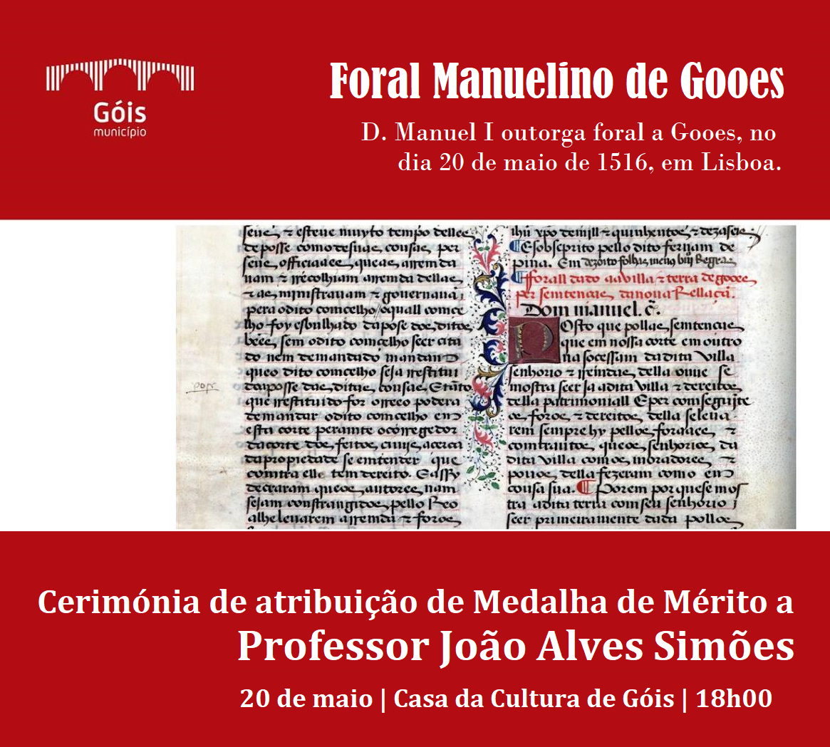 O Executivo deliberou, por unanimidade, na reunião ordinária da Câmara Municipal realizada no dia 09.04.2024, atribuir a Medalha de Mérito ao Senhor Professor João Alves Simões, natural de Ponte do Sótão, Freguesia e Concelho de Góis, simbolizando esta distinção honorífica a dedicação e empenho de toda uma vida à história do Concelho de Góis, no dia em que se comemoram 508 anos da data da entrega do Foral Manuelino de Gooes.