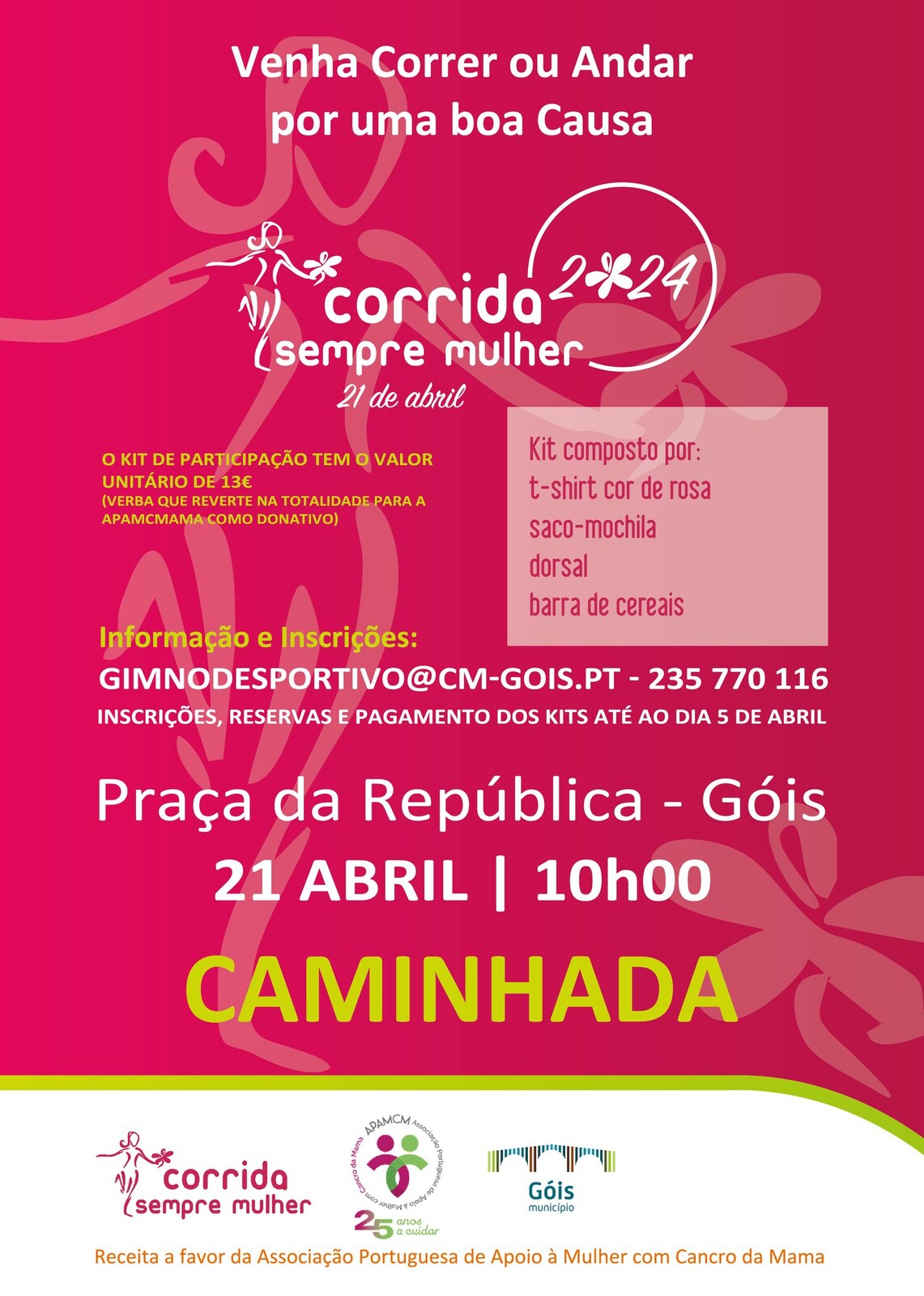 O Município de Góis vai aderir, uma vez mais, à iniciativa "Corrida Sempre Mulher", através da dinamização de uma caminhada de caráter solidário com o objetivo de angariar fundos para a Associação Portuguesa de Apoio à Mulher com Cancro da Mama, a realizar no dia 21 de abril de 2024, com início nona Praça da República de Góis, pelas 10h00.
